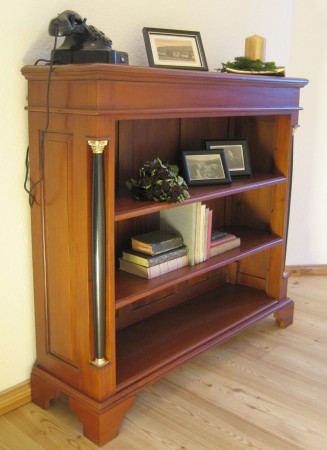 Biedermeier Regal antik massiv für Ihr Büro oder Ihre Bibliothek – wäre das nicht eine Alternative? Lassen Sie sich von dem einzigartigen, antiken Aussehen mitreißen! Der warme Kirschbaum-Farbton und die individuelle Maserung des massiven Mahagoni-Holzes unserer Regale passen in jeden Raum. Die geringe Tiefe des Regals ist ideal für Bücher und Bilderrahmen und schafft zahlreiche Stellmöglichkeiten. Die antiken Stilelemente wie die ebonisierten Säulen, die Messingkapitellen und die detailgetreue Linienführung der Konturen (Antikisierung), der Biedermeier-Zeit finden sich an diesem wunderschönen Möbelstück wieder. An den Seiten sind unsere Biedermeier Kirschbaum Regale mit Kassetten auf Sicht gearbeitet. Nicht nur dekorativ sondern unverzichtbare Elemente um Risse des Massivholzes zu vermeiden. Massiv sind an unseren Regalen nicht nur Korpus sondern auch Rückwände, Seitenteile und Regalböden. Die Regalböden unserer Amotik Regale sind variabel über eine Zackenleiste verstellbar – diese geschieht über herausnehmbare Keile auf denen die Regalböden aufliegen.