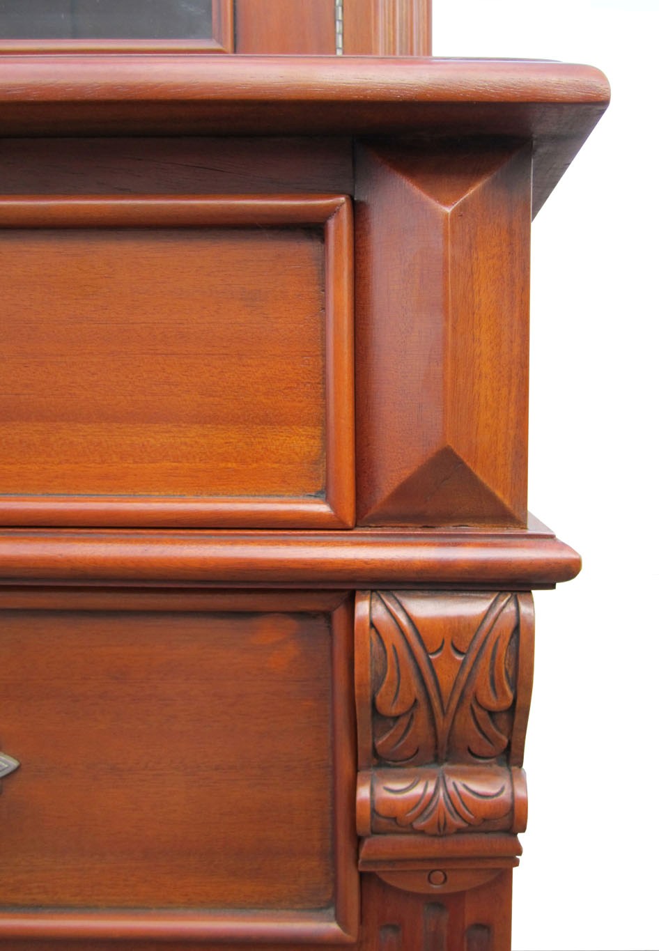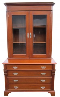 Gründerzeit Vitrine Buffet, Bücherschrank und Kommode in Kombination aus massivem Stil Kirschbaum antik in einzigartiger Formgebung. Dieses Design begeistert über Generationen. Bitte beachten Sie den aufwändig gearbeiteten Kranz des Vitrinen-Teils und den perfekt gestalteten Übergang zum Kommoden-Unterteil. Im Vitrinen- bzw. Bücherschrankteil befinden sich hinter den mit Facettenschliff gearbeiteten Glastüren drei massive Einlegböden – davon sind zwei herausnehmbar bzw. in der Höhe über eine Zackenleiste verstellbar. Die Griffe von Türen und Schubladen sowie die sichtbaren Scharniere sind silberfarben. Korpus, Einlegböden und Rückwand sind aus Massivholz gearbeitet. Massiv verzapft sind auch die Schubladen. Die zweiteilige Anlieferung („Vitrine“ wird in die „Kommode“ gesteckt) stellt die einfache Handhabung beim Transport wie z.B. in engen Treppenhäusern sicher. Wunderschön fügen sich die zusätzlich schwarz eingefärbten Konturen in die gesamte Erscheinung dieses Gründerzeitmöbels ein und unterstreichen den antiken Stil (Antikisierung, siehe Detailbilder).